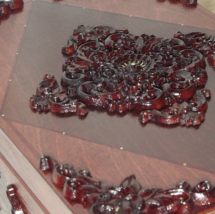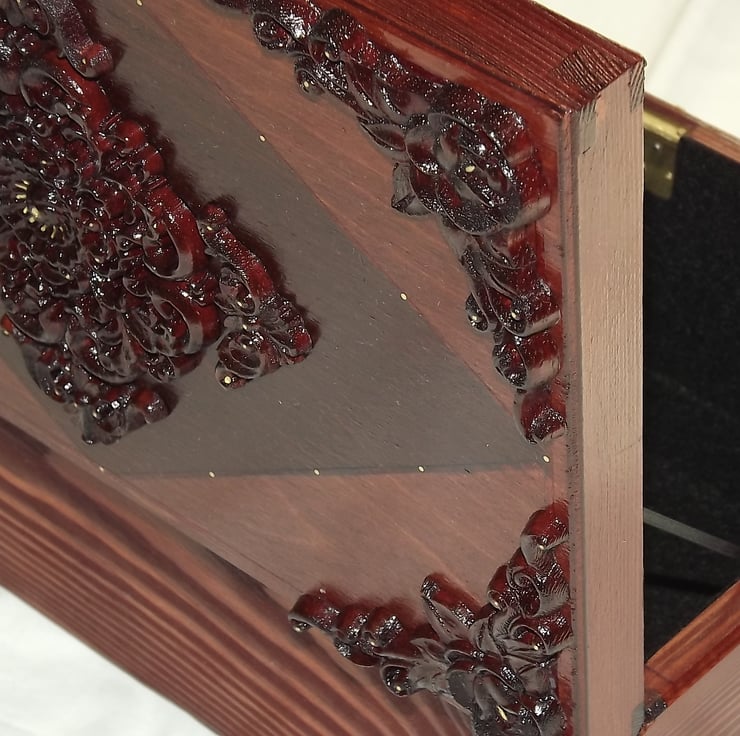 1. Beautiful Ornate LOCKABLE Wooden Box - Red Mahogany and Walnut Stain.