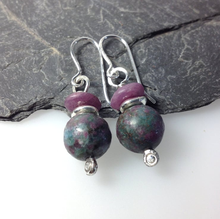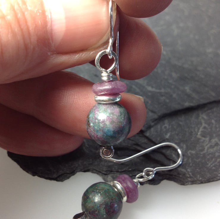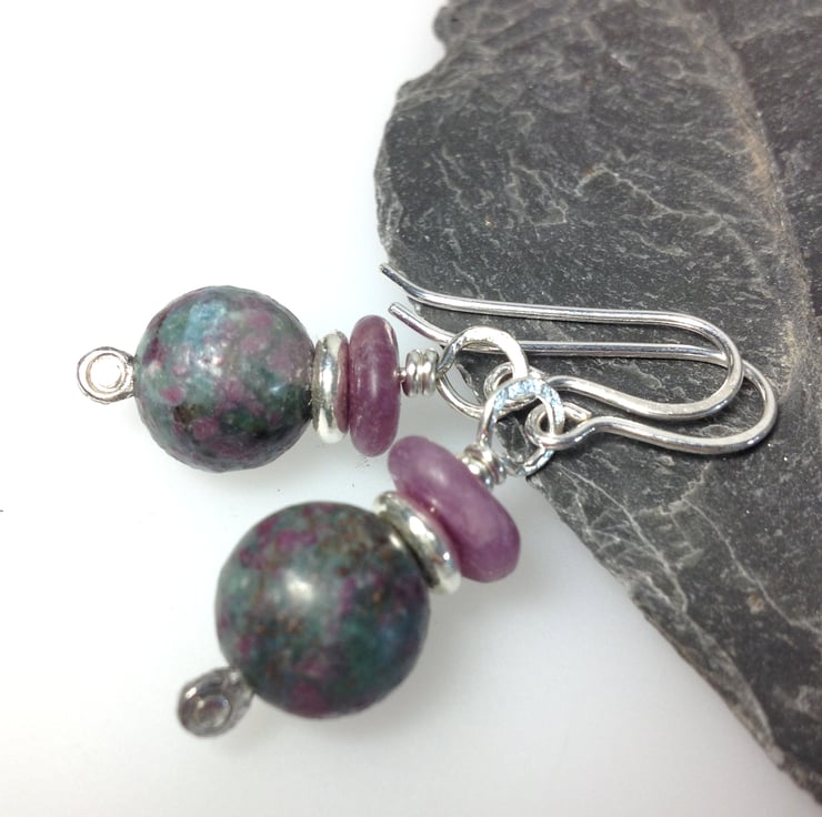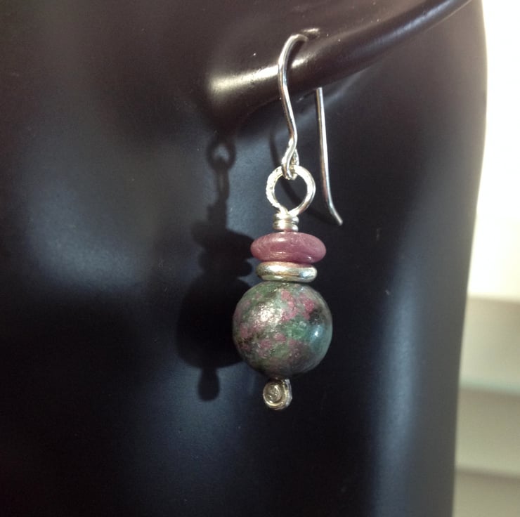 Simple silver earrings with ruby and ruby in apatite beads.