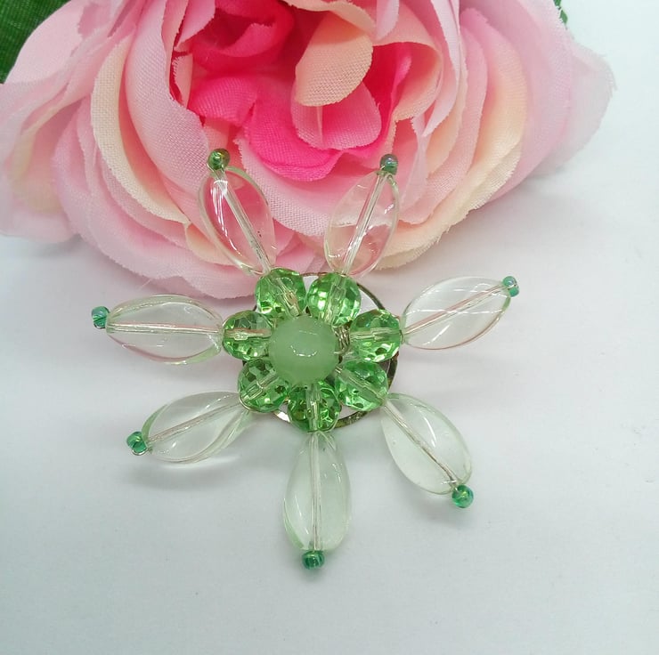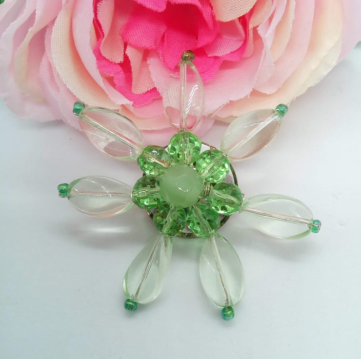 The brooch is made using oval glass beads, crystal round beads and seed beads in a mixture of sizes. The glass oval beads are 15 mm x 8 mm, the round glass beads are 6 mm and 8 mm. The brooch measures 50 mm overall in diameter. It is secured onto a silver plated back.