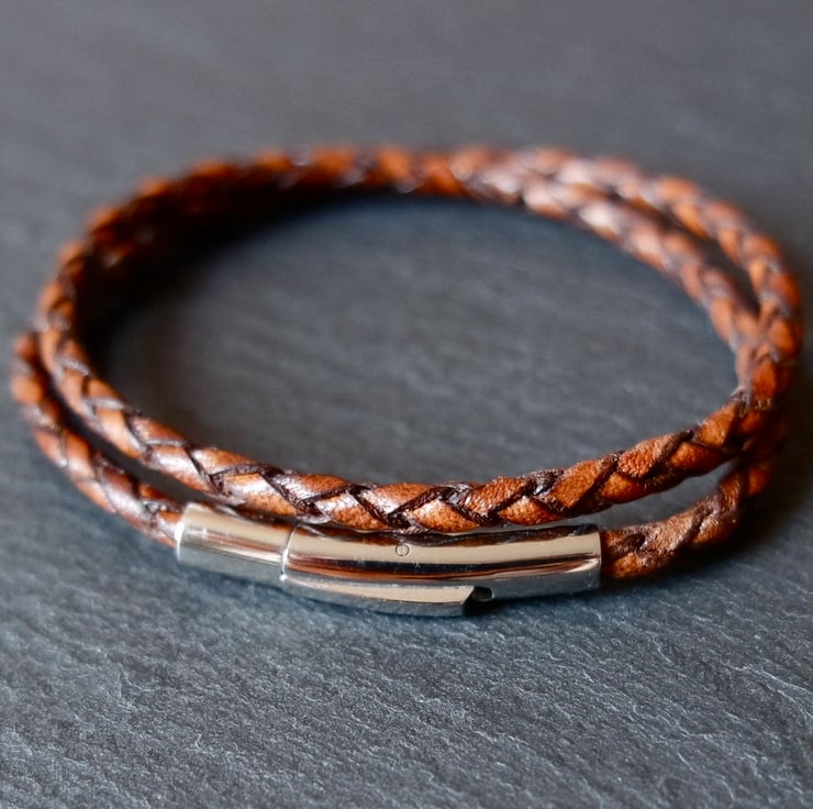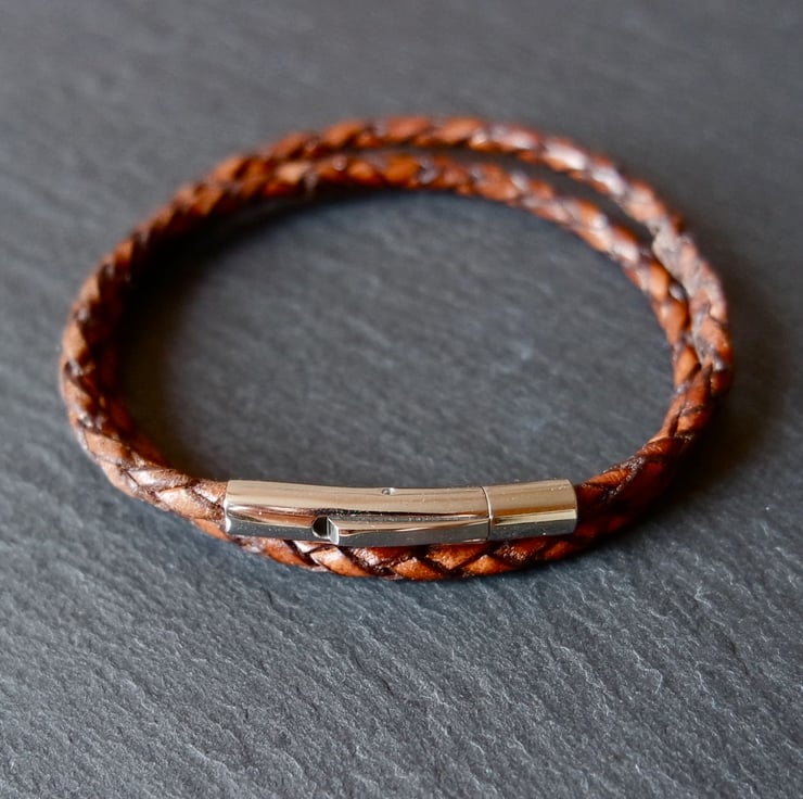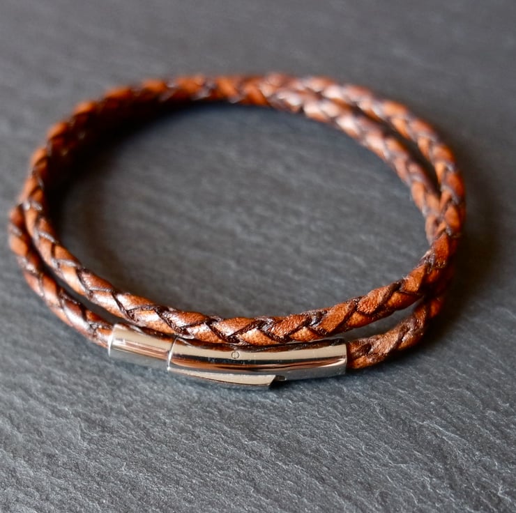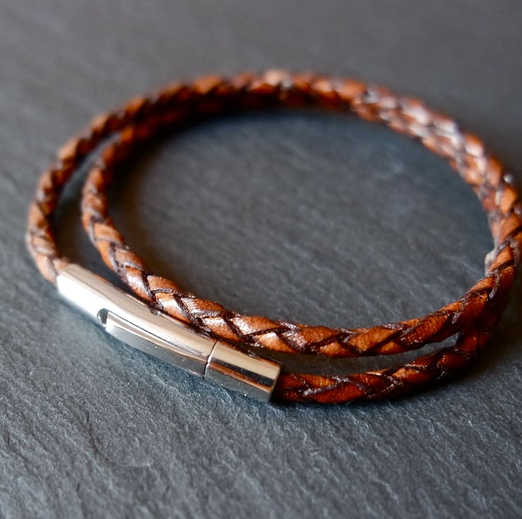 A wonderful unisex braided leather wrap bracelet with a stainless steel bayonet clasp.