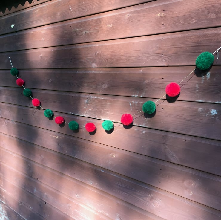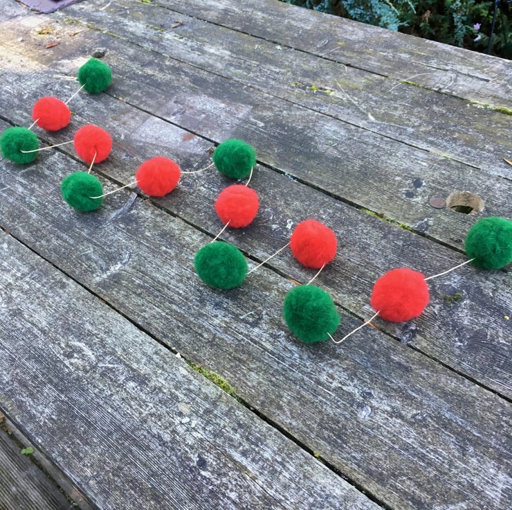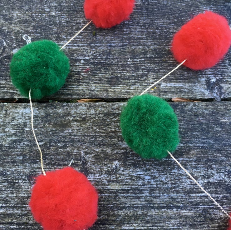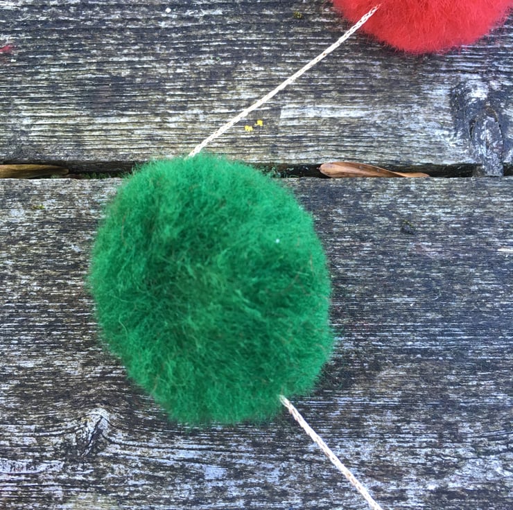 This Christmas garland is made up of 13 pom poms threaded onto a gold coloured thread. Each pom pom is made from corriedale woollen fibres and measures approximately 5cm (2") in diameter. The pom poms are super fluffy and alternate in colours of green and red along the length of the garland. The pom poms are moveable and can therefore be spaced along the thread at whatever interval you require. The total length of the garland is 180cm (71")