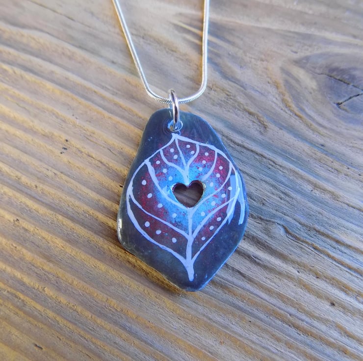 A piece of slate turned into a pretty pendant. The slate has a heart drilled in the centre, then it has been coloured, had a hand drawn leaf design applied then set with a thick coat of shiny glass like resin. set on a simple jump ring bail and 18 " silver one snake chain.