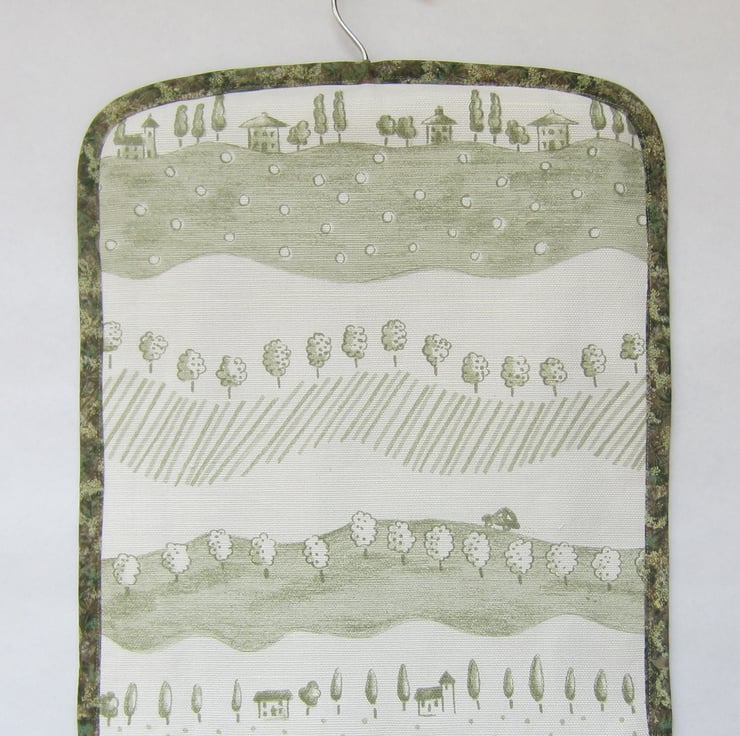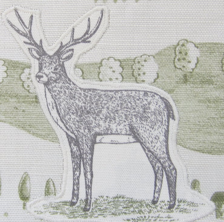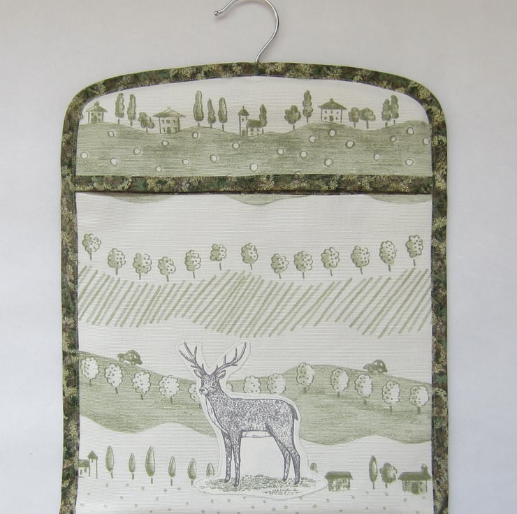 Sturdy peg bag made from a green and cream house and tree design fabric with added appliqued stag. It is edged with a multi green coloured bias binding and is fully lined with a cream and fawn striped fabric.