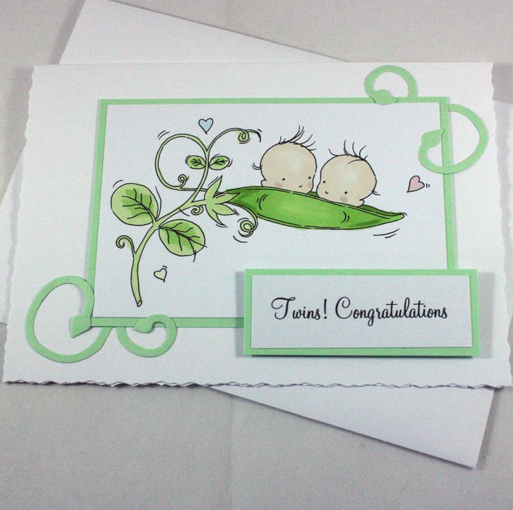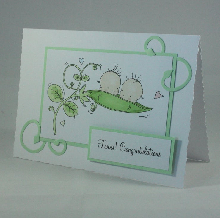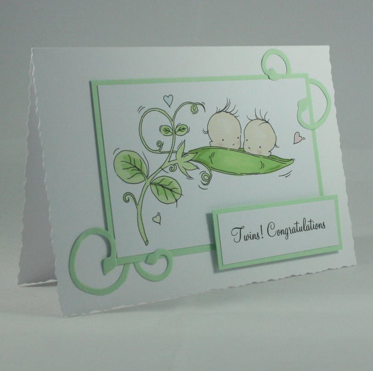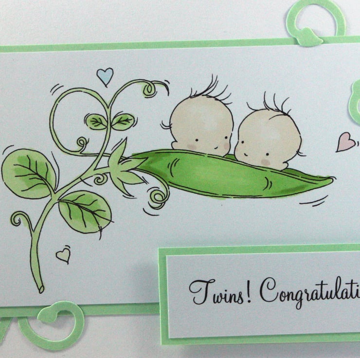 The image has been overlaid onto pale green card, along with the sentiment reading 'Twins! Congratulations'. The image is surrounded by a die cut flourish, also in pale green card. Given the colour scheme, this card is suitable for twin boys, twin girls or one of each.