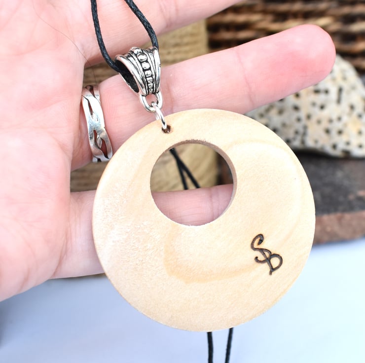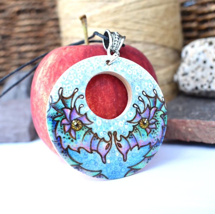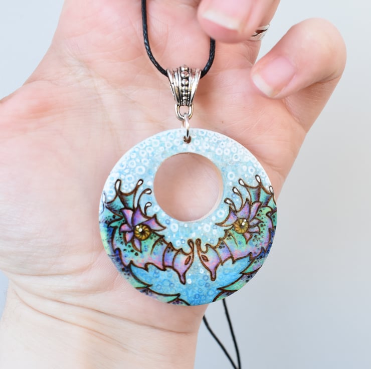 A romantic seahorse couple nose to nose adorn this circular pendant. Burned into the wood using pyrography, and hand coloured. A lovely gift for a sealife lover, and a great idea for a wood anniversary gift (5 years marriage).