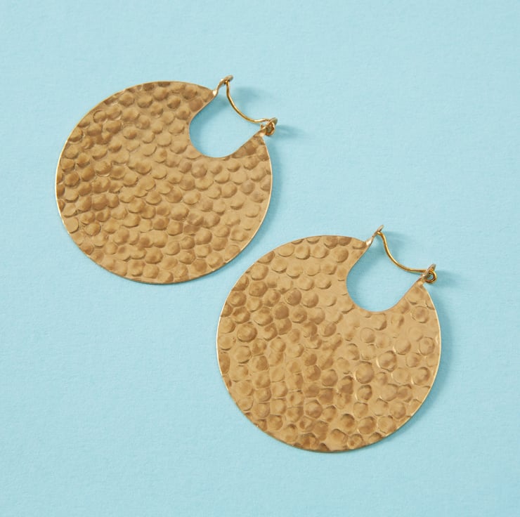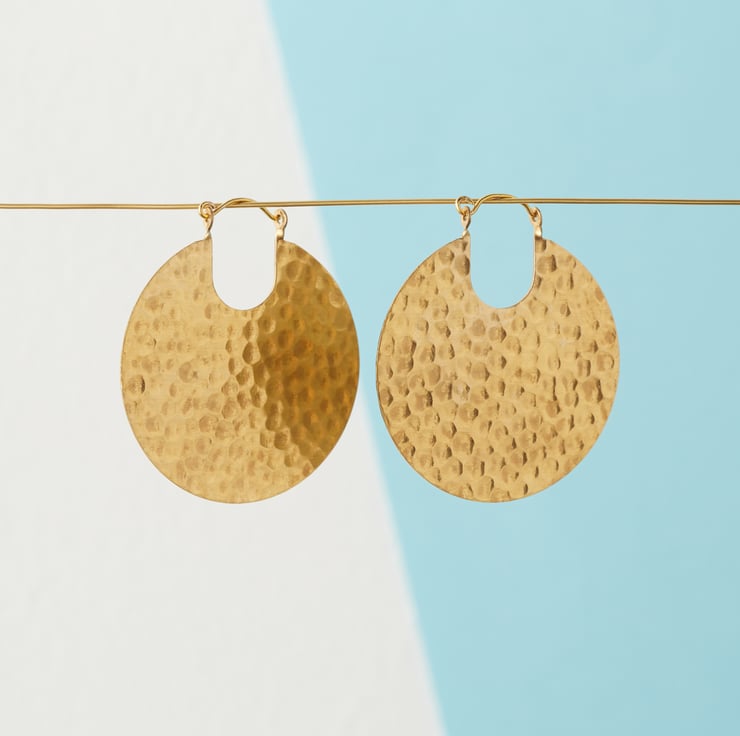 These on-trend statement earrings feature large, thin discs cut from raw brass with a hammered finish. Their multi-faceted, beaten brass surface gives them a wonderful shine.