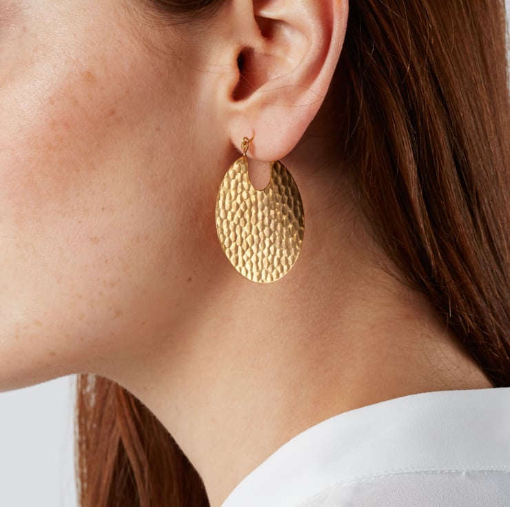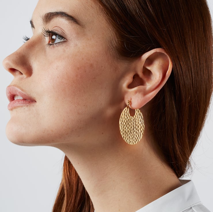 These round, tribal-inspired pieces are then fixed to ear wires with a discreet hook-and-hole fastening so they’re extra secure: to open, simply push the ear wire forward and slide it out of the hole. Use a mirror first time and you’ll have the hang of these in no time!