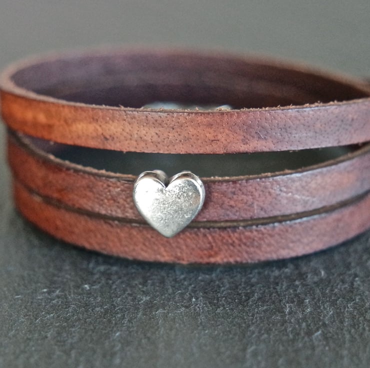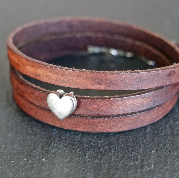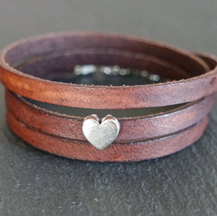 A brown leather wrap bracelet with a beautiful silver plated heart charm.