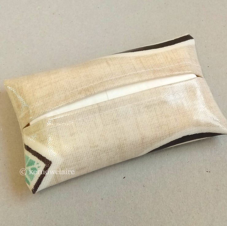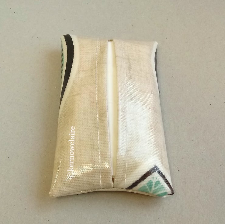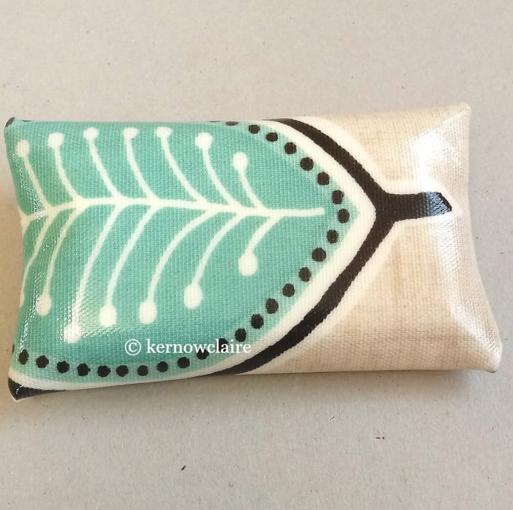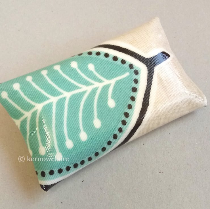Handmade in a beige oilcloth with large turquoise leaf pattern