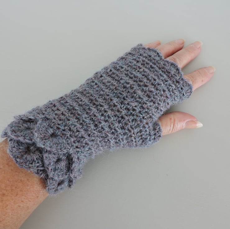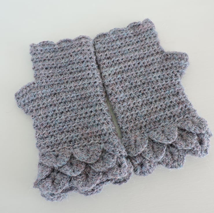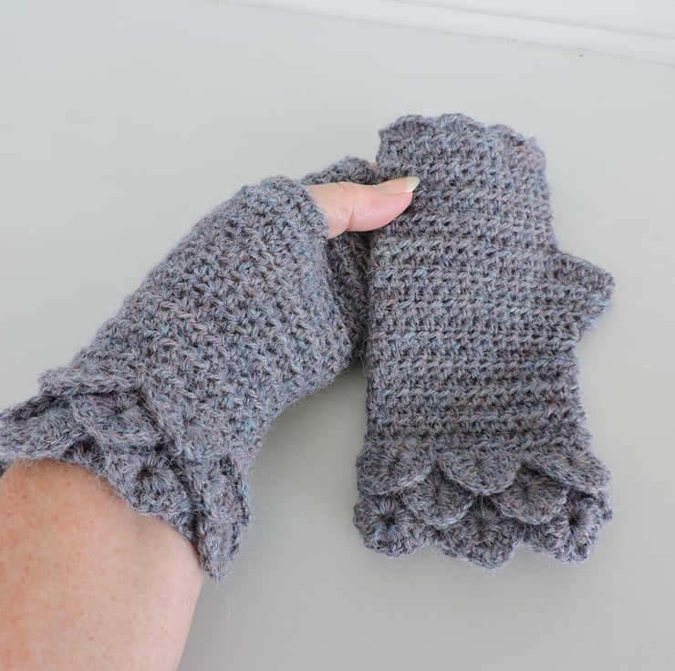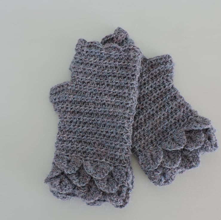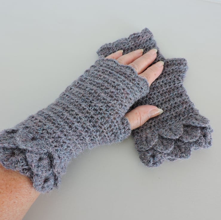 These stylish adults dragon scale cuff fingerless mitts, gloves, come wrist warmers have been crocheted in a soft alpaca and acrylic double knit yarn. Ash grey with a hint of heather. These mitts are soft and warm.. Ideal winter warmer. Steampunk, goth inspired.