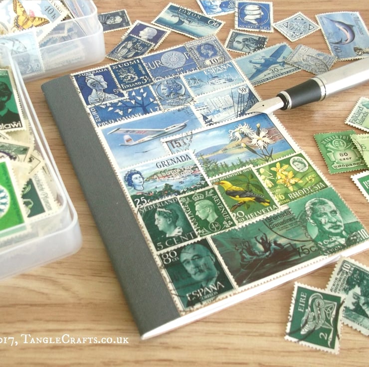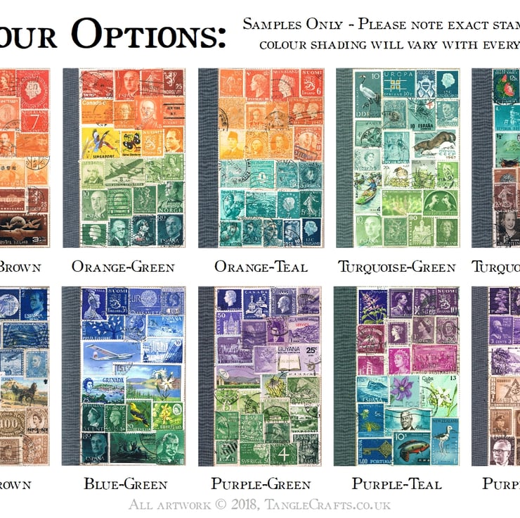 The front cover is entirely covered with used postage stamps, then coated with a matt sealant for extra durability. The inner front cover will be signed & dated.