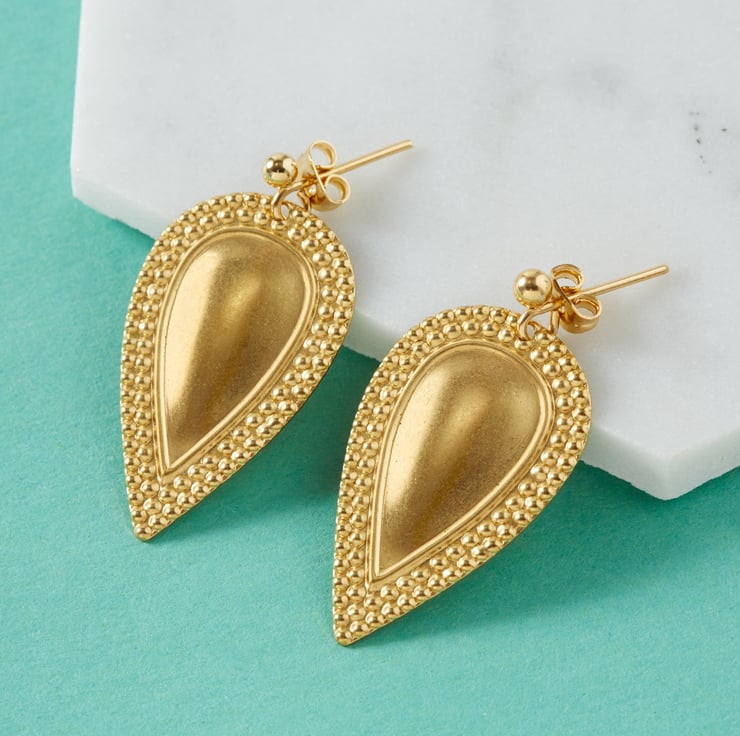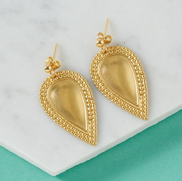 Raw brass teardrops on gold plated nickel-safe ear posts, adhering to EU regulations.