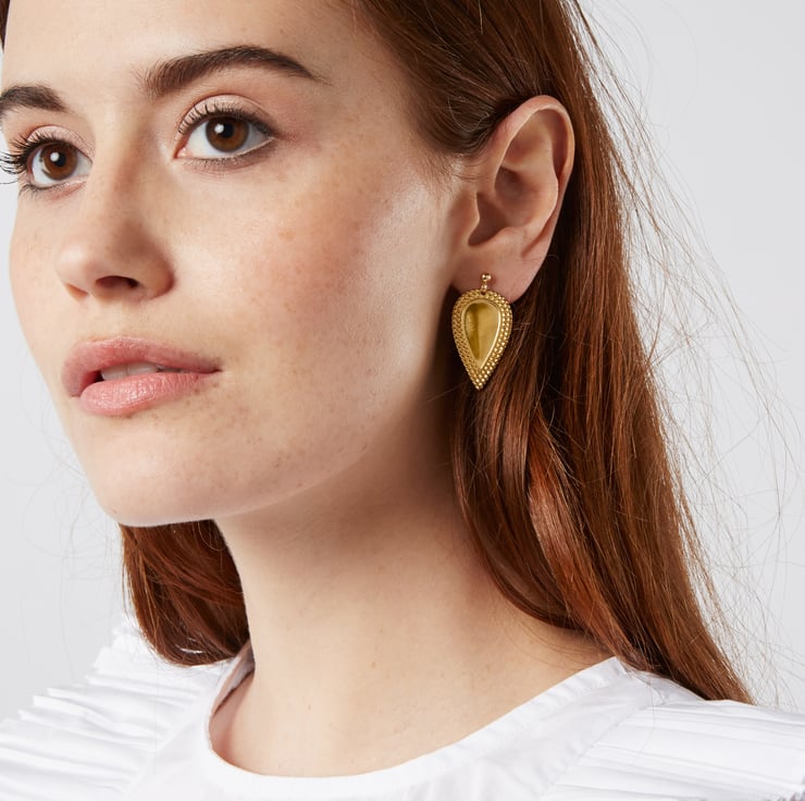 Dangling from gold ear studs are thin teardrops in beautiful raw brass, giving them a slightly matte finish.