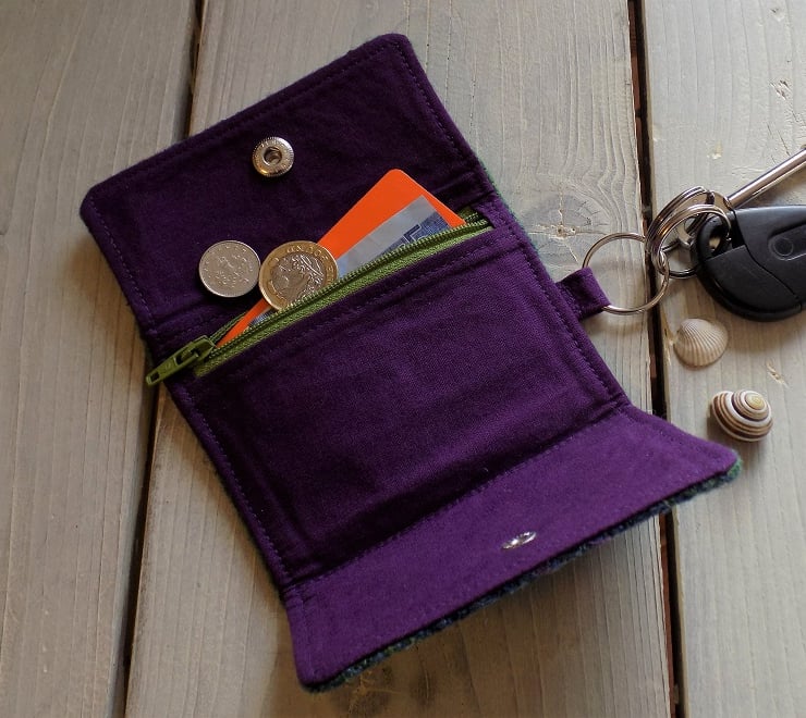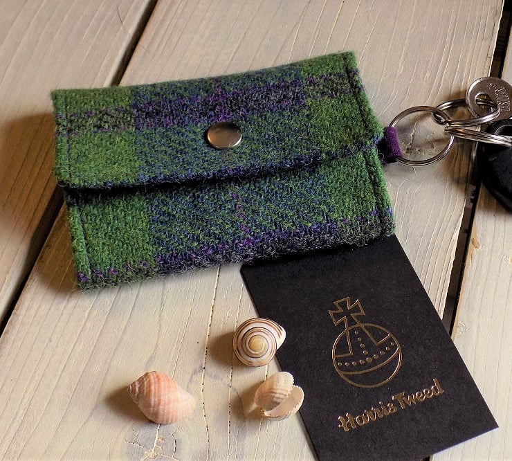 Harris Tweed keys wallet/small coin purse: all you need to keep your essentials organised in your pocket or bag and prevent your keys wearing holes in your pockets. Tartan weave in pea green, blue and violet purple with aubergine purple cotton lining. A zipped pocket in the lining is just big enough to fit a credit card, folded banknotes and coins.