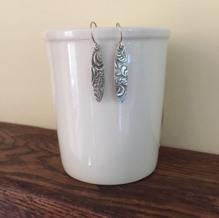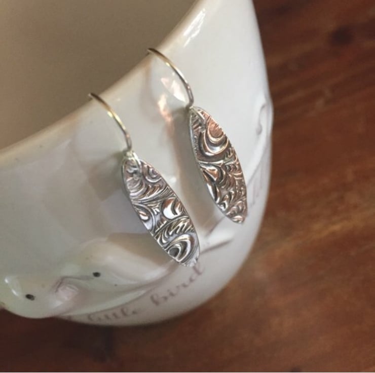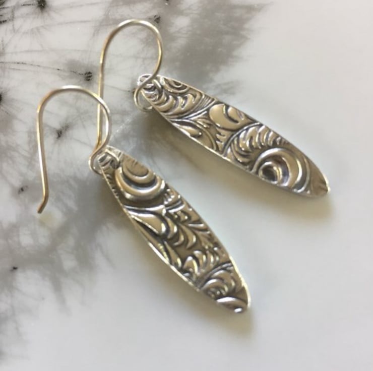Handmade long fine silver earrings with a beautiful ornate pattern embedded into the silver. The approx width (at the widest point) is 8mm and the length is 30mm (not including ear wires).
