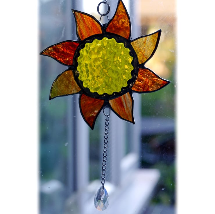 The centre of the sun is bright yellow textured glass and the rays are red and amber.