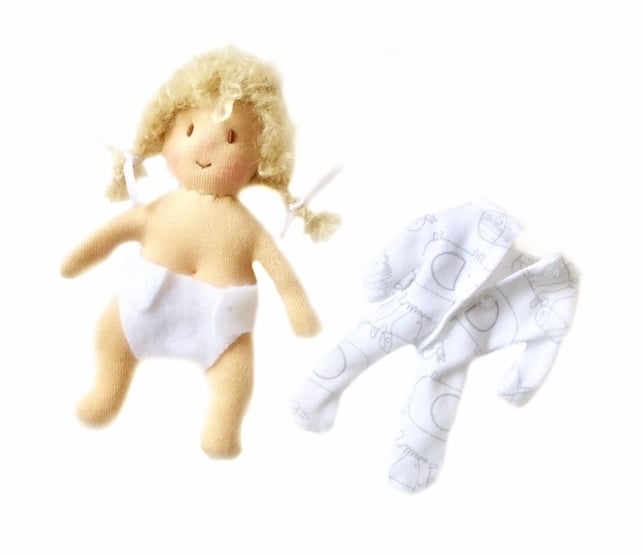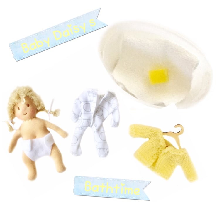 Baby Daisy is all ready for her bath with this cute little set comprising Baby Daisy, made from best quality doll skin, with a removable nappy, a white baby bath, a white towel, a sponge, a tiny sleep suit and a lemon cardigan.
