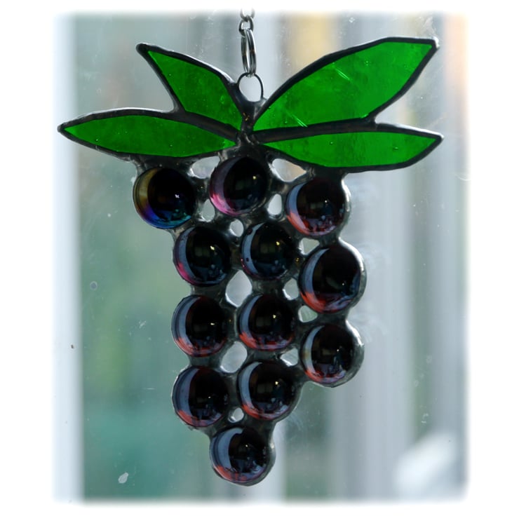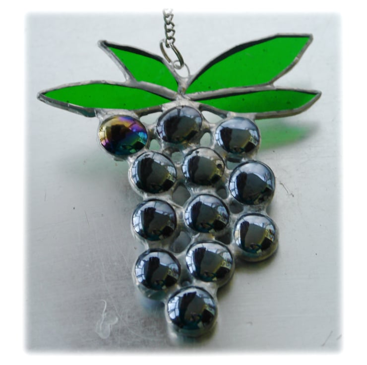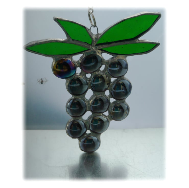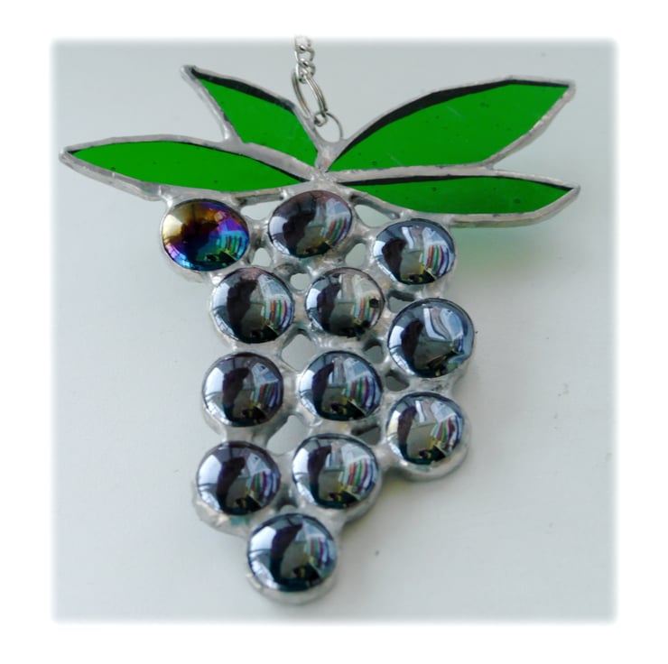 The bunch has 12 shiny grapes hanging under 4 leaves. The grapes are made from deep purple glass nuggets.