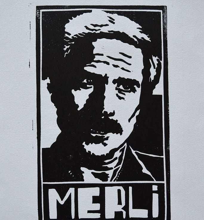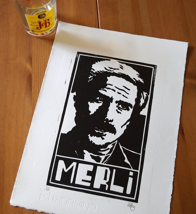 A lino print of Italian movie star, Maurizio Merli. The image itself is 25cm x 15cm and the overall print is 35cm x 25cm, and is in an edition of six, of which five are available.