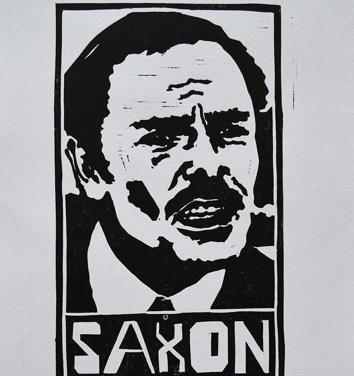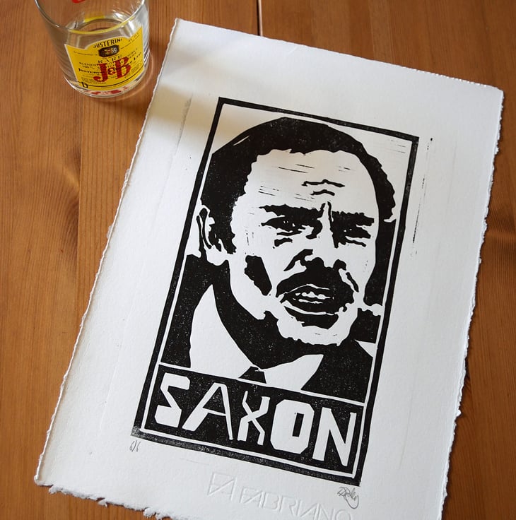 A lino print of American movie star, John Saxon. The image itself is 25cm x 15cm and the overall print is 35cm x 25cm, and is in an edition of six, of which five are available.