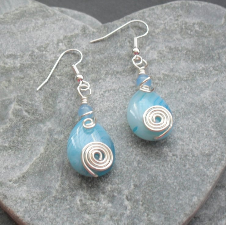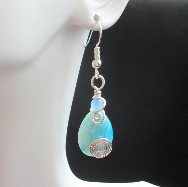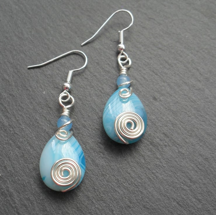 Wire wrapped earrings with blue stripped agate drop semi precious gemstones small blue dyed round quartz which are then attached to silver plated copper ear wires