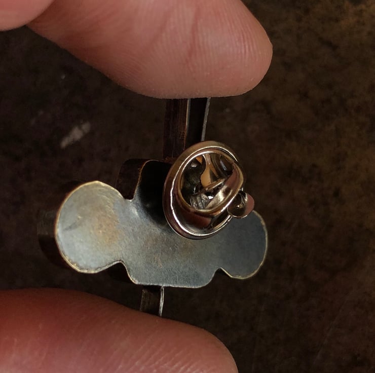 It has a sterling silver pin on the back and is secured with a butterfly squeeze clasp.