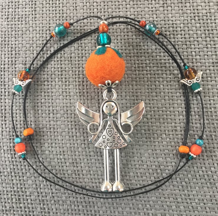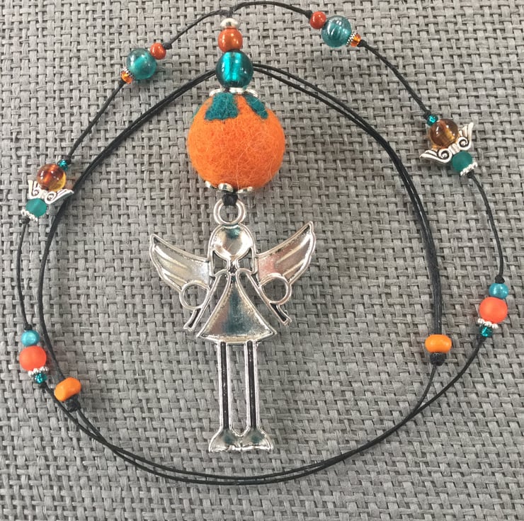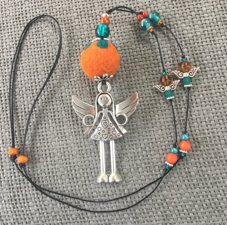 Pendant necklace featuring a glorious mixture of beads including gorgeous felt, wood, glass, Polaris and miracle beads, Tibetan silver angel wing beads,with a beautiful antique silver style Angel charm, all strung on a waxed linen thread.