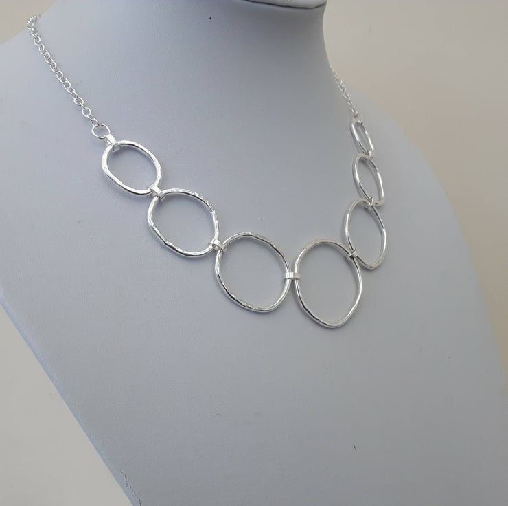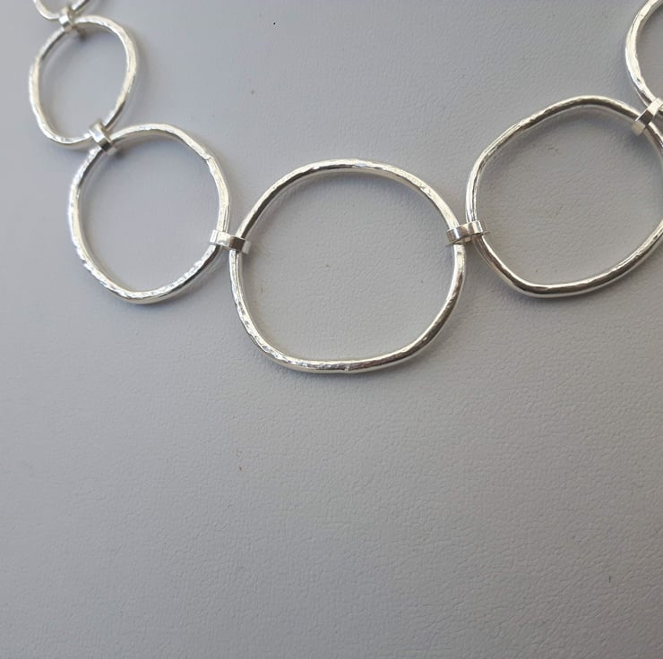 This beautiful sterling silver link necklace has been handmade by me using traditional techniques. There are seven large links made from 2mm sterling silver wire, forged with a ball-pein hammer to make it sparkle. I have left the links in the natural organic shapes formed by the hammering process - irregular circles and ovals ranging from 1.8-3.6cm (0.7-1.4inches) in diameter. They are joined by smaller oval loops and finished with a sturdy sterling silver trace chain and a handmade hook and loop clasp. The clasp has been hallmarked by the London Assay Office with traditional silver hallmarks including my own maker's mark. The total length is 45cm (18inches) and the necklace weighs 21g. The hook will go through any of the links on the chain so you can adjust the length to suit yourself.