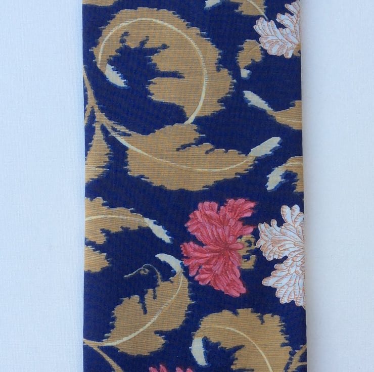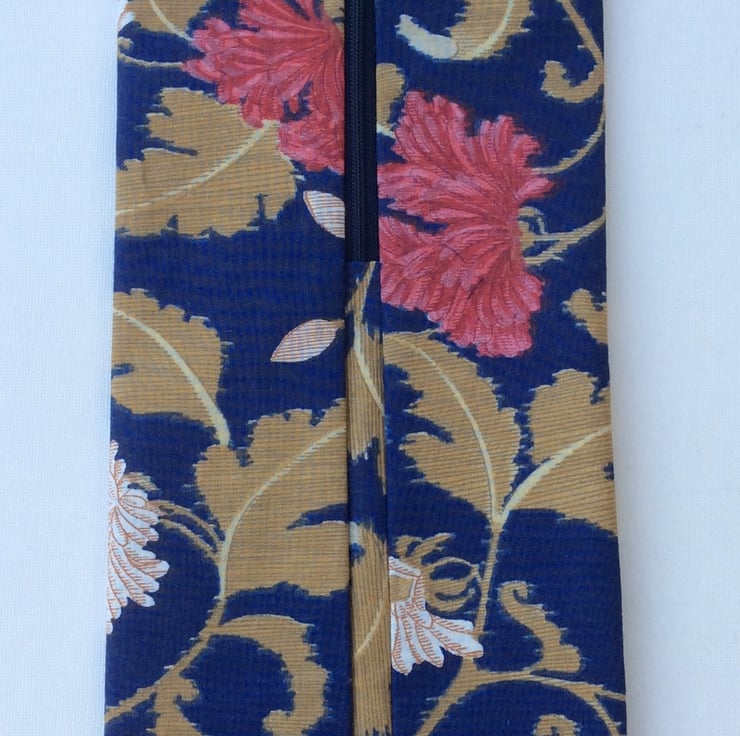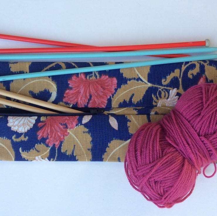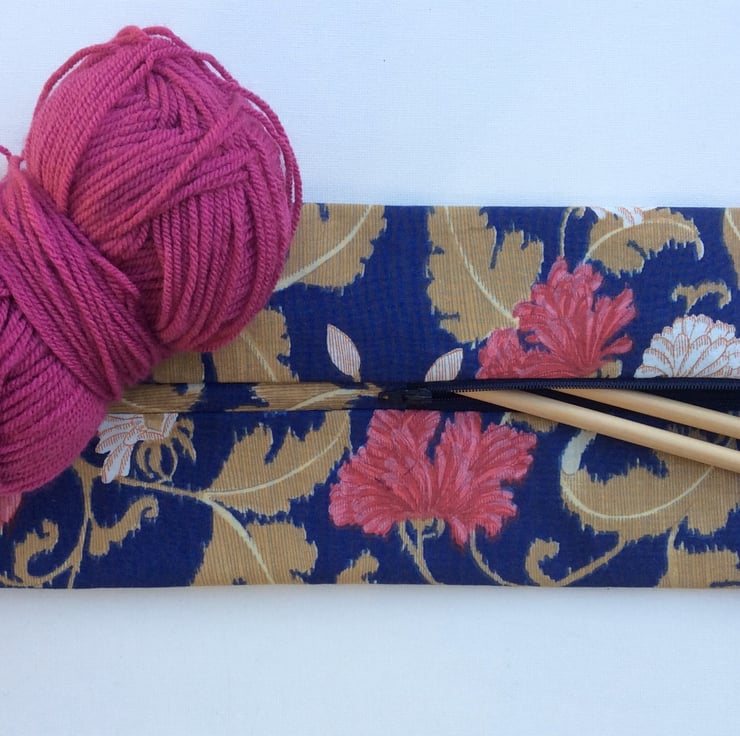 Perfect for storing lots of loose needles. This zipped knitting needle bag is approximately 41cm x 14.5cm, ( long enough for the longest knitting needle?).The fabric is cotton, floral on a dark blue background with a navy blue lining and an 18cm, navy blue zip. The bag is lightly padded for strength and structure.