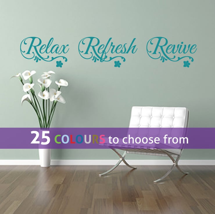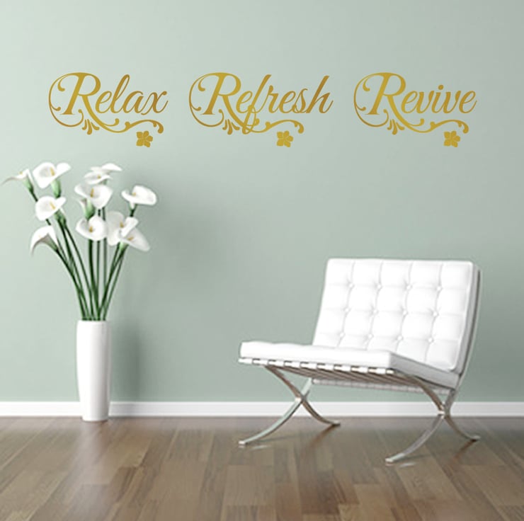 RELAX REFRESH REVIVE quote design with swirls and flowers wall art sticker decal in white colour