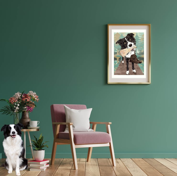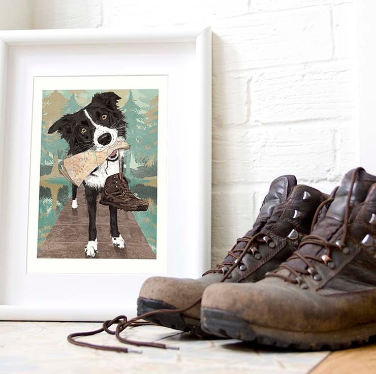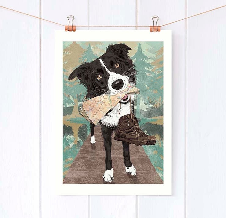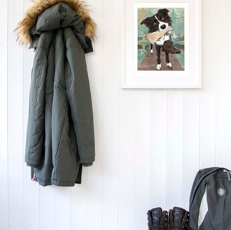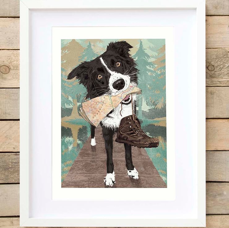This luxurious Border Collie wall art features Ada the Border Collie holding a map of Cumbria. This print would make a fantastic gift for men or dog lover gift ideas, gift for hikers or any admirers of the Border Collie breed. This Collie wall art illustration would also make a great gift for Lake District lovers, fell walkers or anyone who loves the great outdoors.