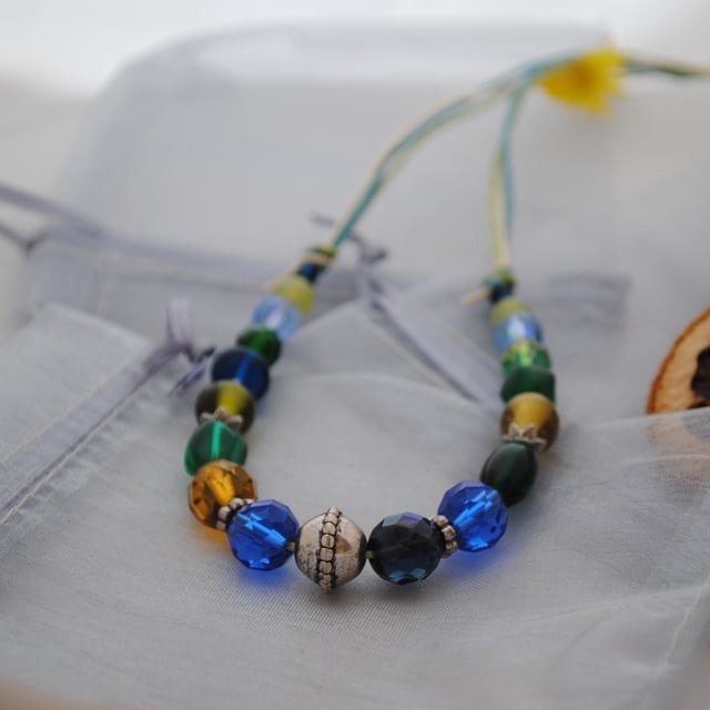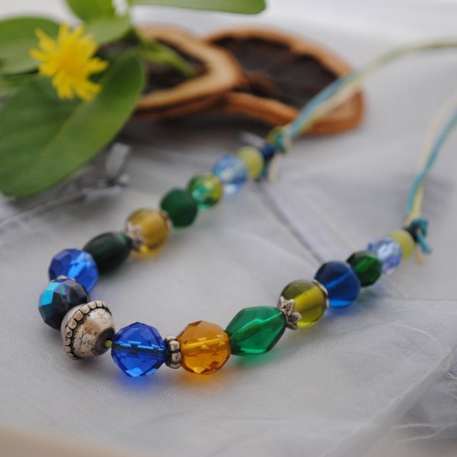Necklace with a mix of beads in sapphire, capri blue, forest green, lime and silver This unique necklace hangs from a mix of strings - turquoise, lime green and cream waxed cotton cord finished with a silver plated lobster clasp. The beads are in a variety of shapes and sizes and include silver beads.