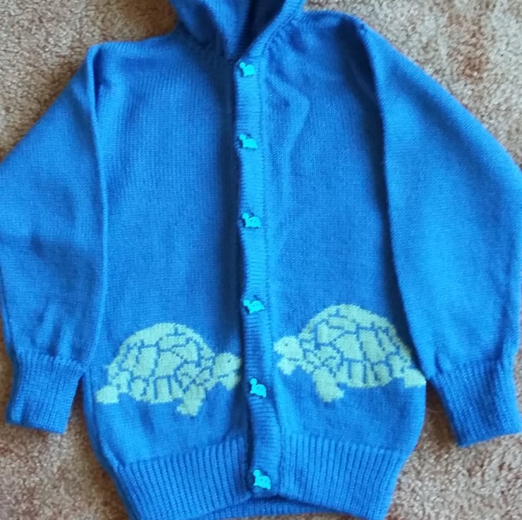 Tortoise cardigan with tortoise motifs on either side and tortoise buttons. This one has a hood but it can be made without if you prefer. It can be made to order in any colour in machine washable merino blend wool or cotton. The price is £24.50 with a hood or £22.50 without.