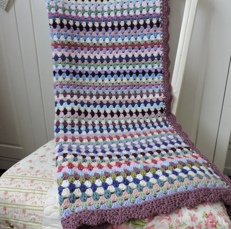I've crocheted this colourful lap blanket, baby blanket in soft acrylic double knit yarns. A miriad of assorted colours, pinks, greens, blues, white, cream, mauves. Finished with a wavy border in grape.