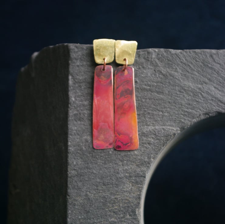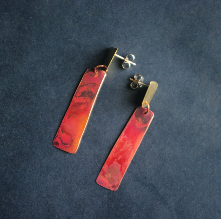 I have cut out a long rectangles of copper and given them Autumn orangey red tones through a heat process. These colours are protected with a penetrating wax.This piece dangles from a rough brass square , which sits neatly on the earlobe and is fastened to the ear by a sterling silver earpost and butterfly back
