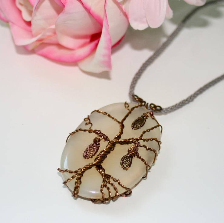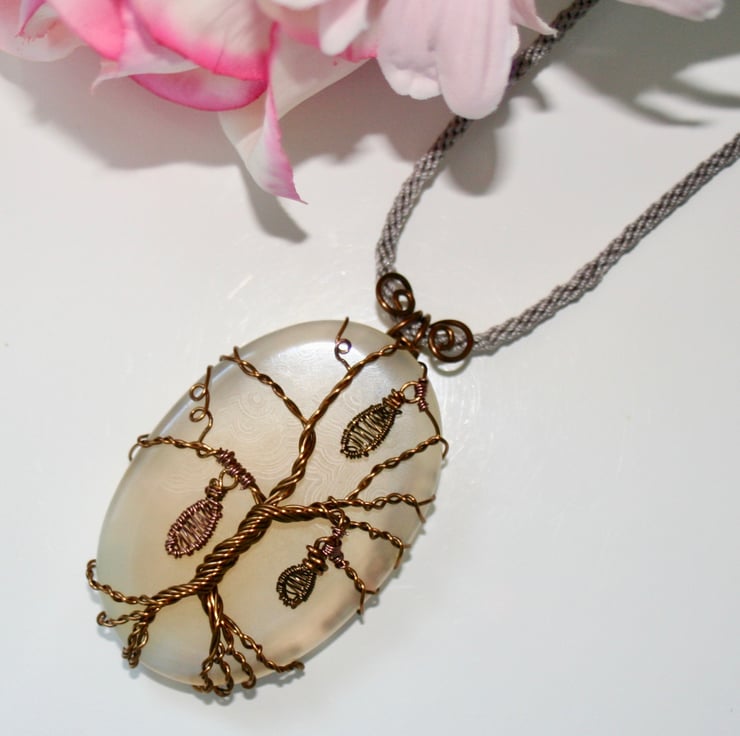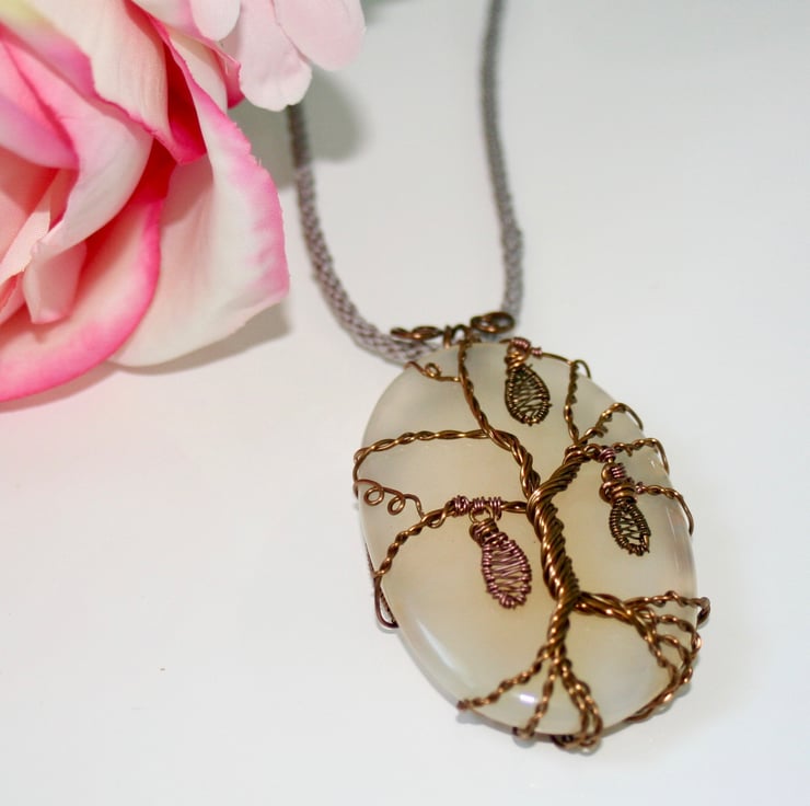 A unique pendant comprising a piece of creamy translucent grey/white agate that has been wrapped with antique bronze wire tree. Delicate bronze and copper wire wrapped leaves hang from the tree branches.