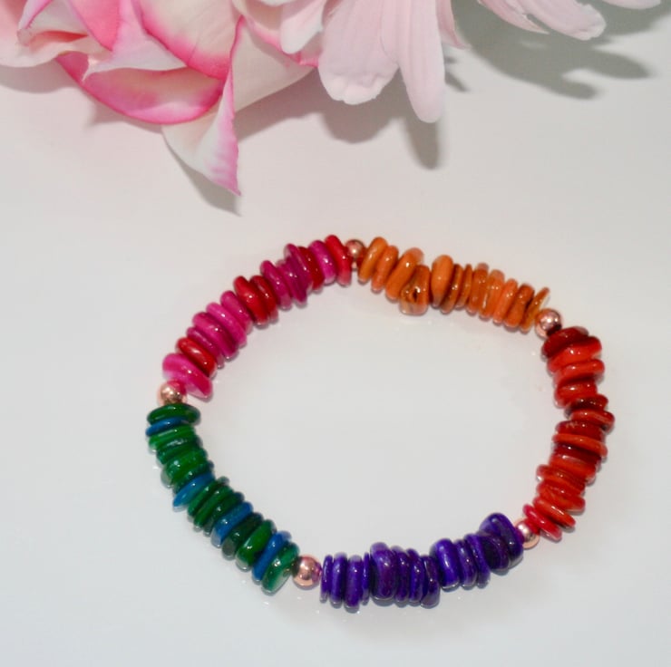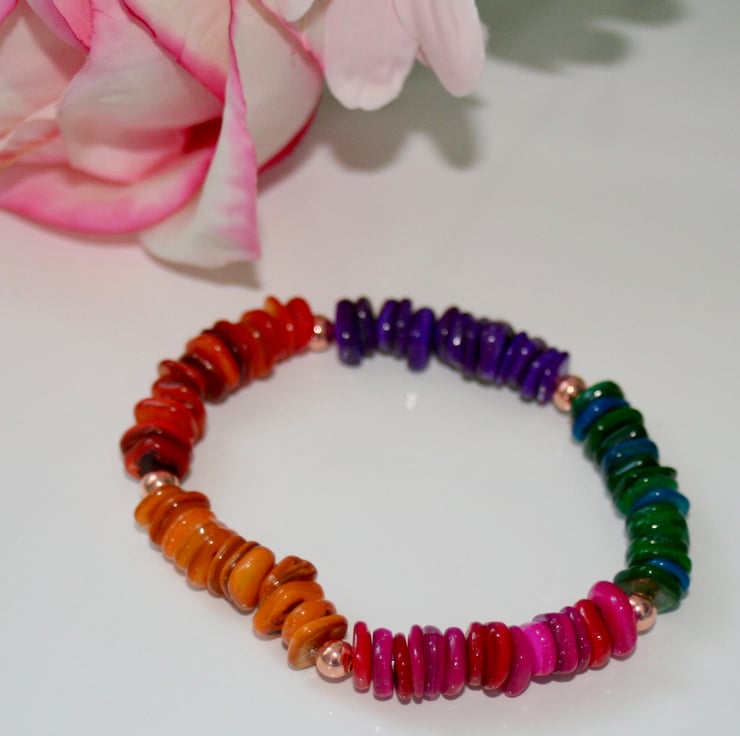 A fabulously colourful stretchy bracelet made with square shell beads in colours of the rainbow, separated with copper beads.