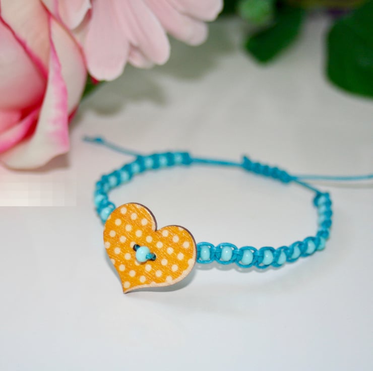 A fun bracelet made from cotton cord which has been braided with blue seed beads using the macrame technique. A yellow wooden button with a spotty pattern is the focus.