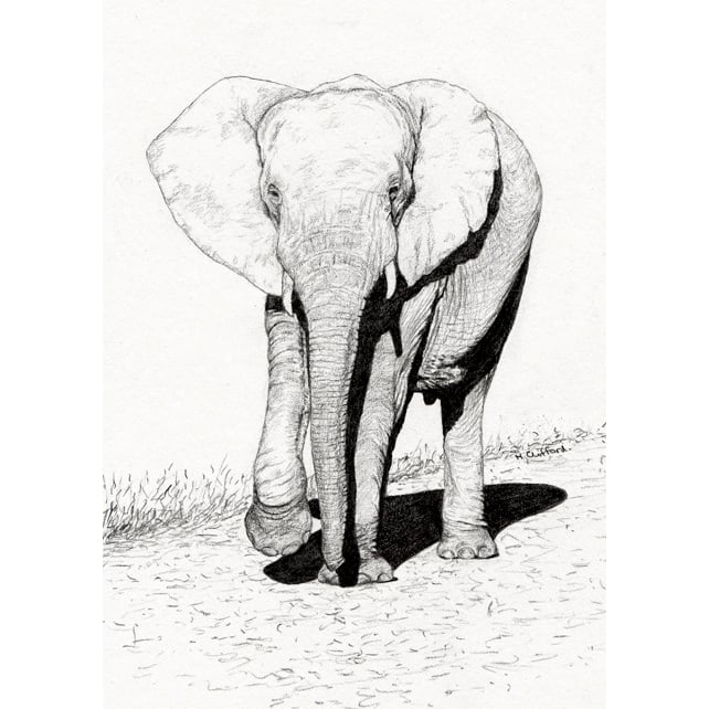 This is a unique original drawing of an African elephant. Walking towards us along a rough path, her front foot is lifted as she takes a step. Her great ears are flapping and the strong sunlight from almost directly above creates strong dark shadows. A small pair of tusks show beside her long sensitive wrinkled trunk. Graphite pencil is the perfect medium to draw the textures of her deeply folded skin and the little crinkled edges to her ears.