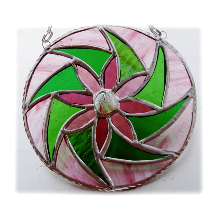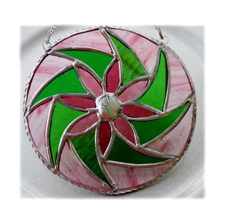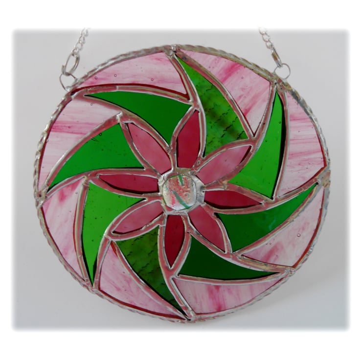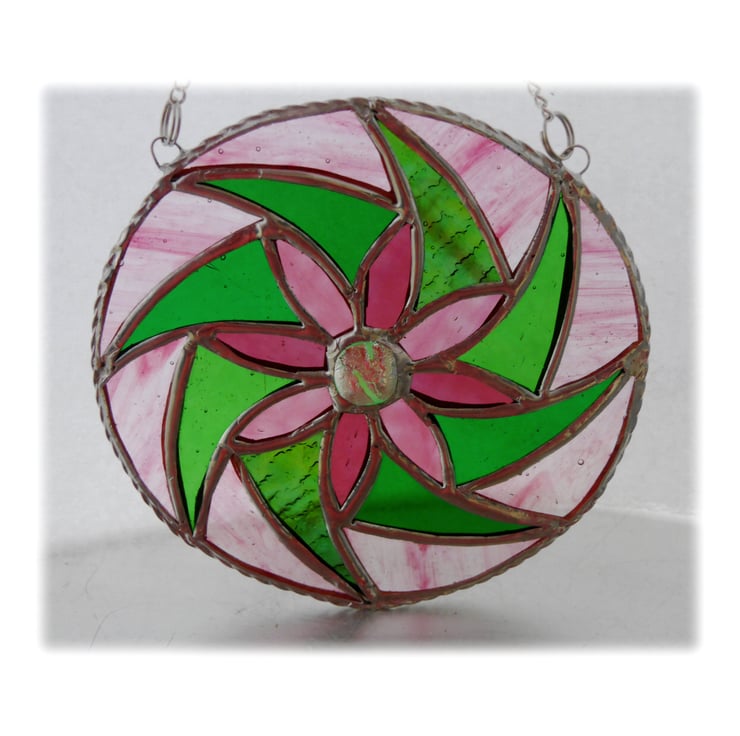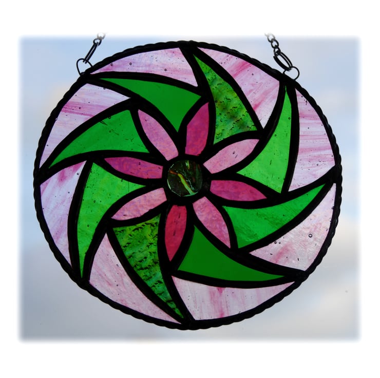 The leaves are in 4 types of green glass to give movement and the pink border a lovely streaky pink glass.