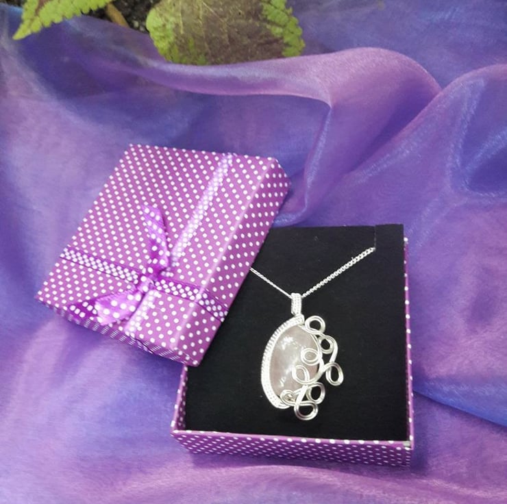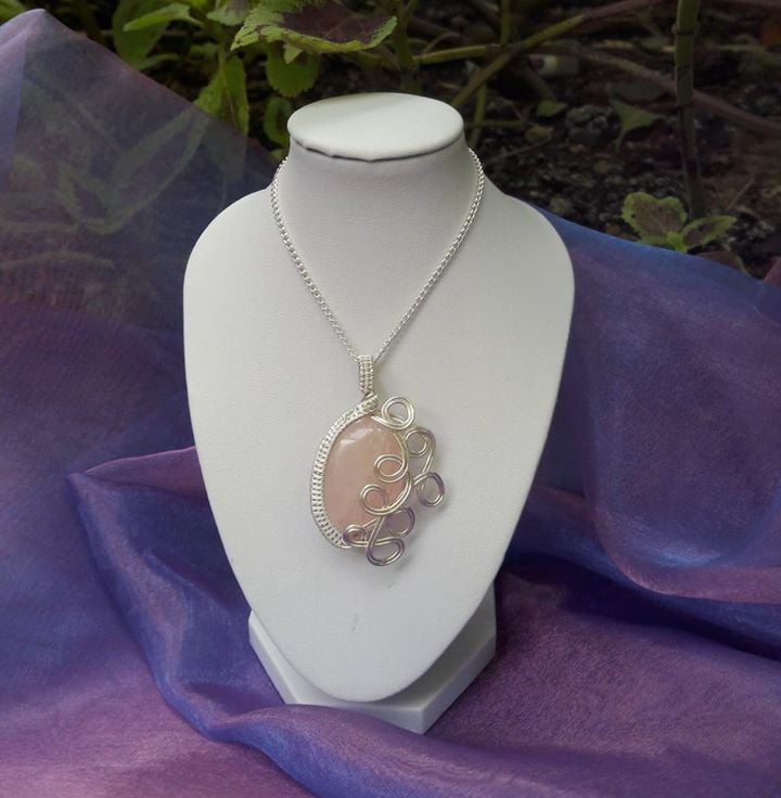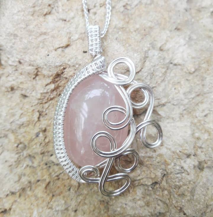 Rose Quartz Gemstone wire wrapped, silver plated Necklace. This piece is handmade by wire weaving a number of wires together to create this beautiful cloud like effect piece. The natural swirls to one side are shaped around the colourful gemstone.