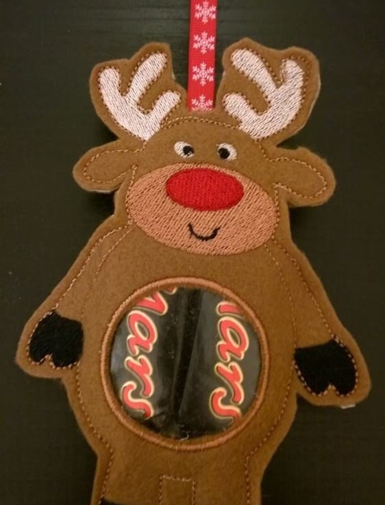 Hanging Reindeer treat bag. Big enough to hold the treat size sweets, he stands about 7 inches tall not including the hanging ribbon.