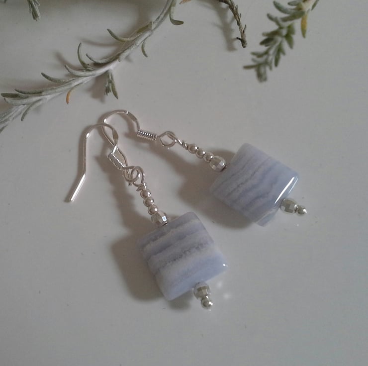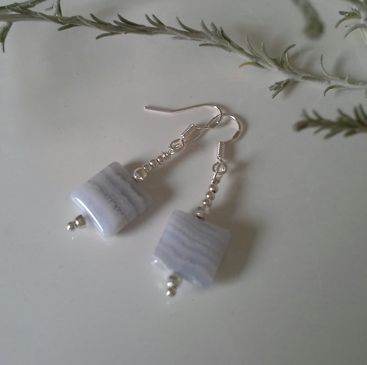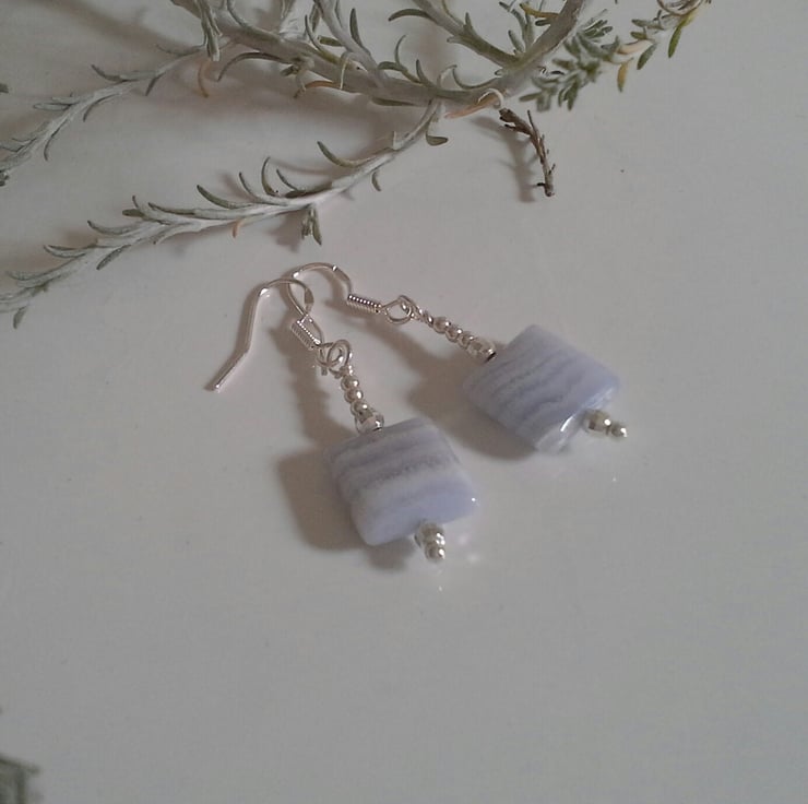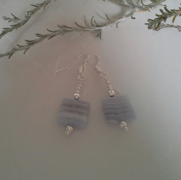 A beautiful dainty pair of earrings designed and hand crafted using 10mm by 10mm blue lace agate pillow cut square gemstones with a calculated 10.60ct weight. They are complimented with all 925 sterling silver components. True blue lace agate is much revered by avid gemstone jewellery collectors whom only wish and expect quality.