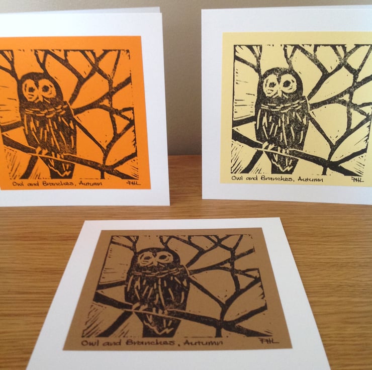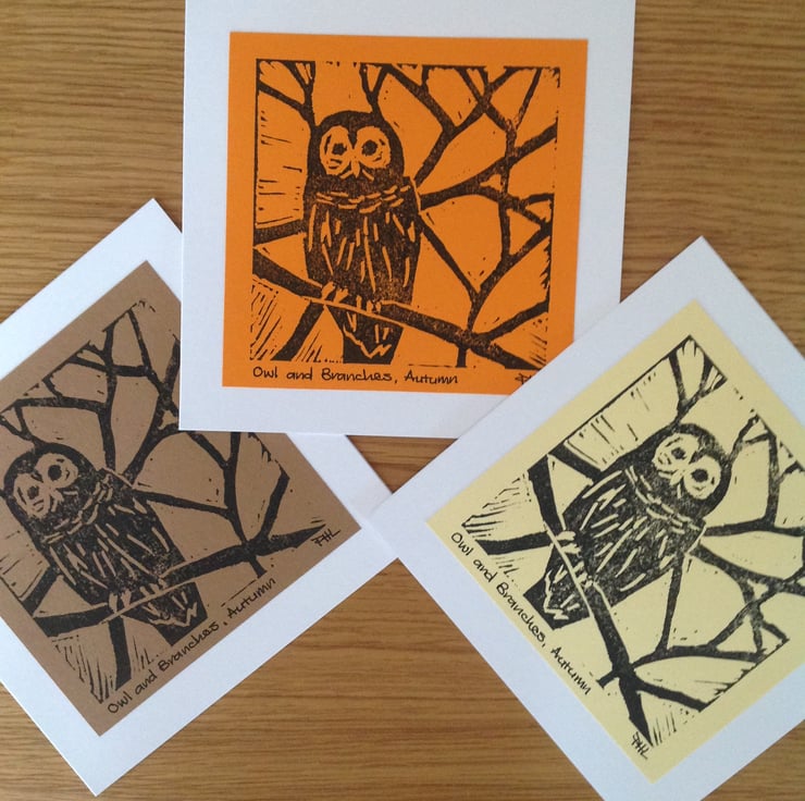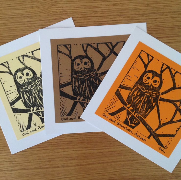 A useful set of three any occasion cards featuring a hand printed owl and created from my own carving. Each card has been individually printed by hand onto quality paper in autumnal hues.