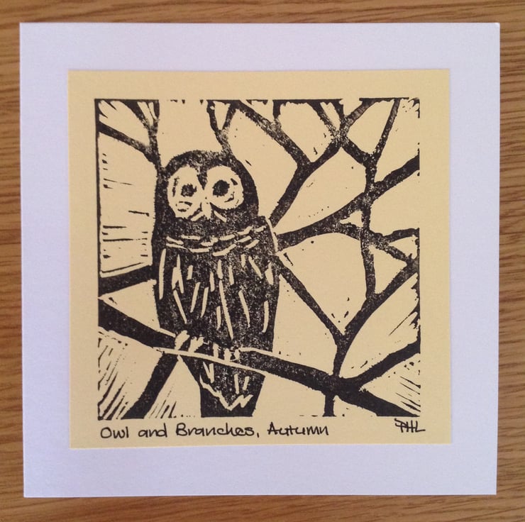 The owl print has been mounted onto a white square card measuring 14.5 X 14.5 cm. The cards have been left blank inside for your own message. They have accompanying white envelopes.