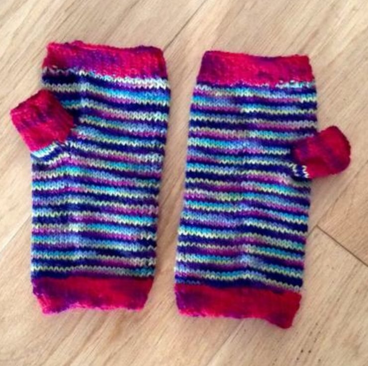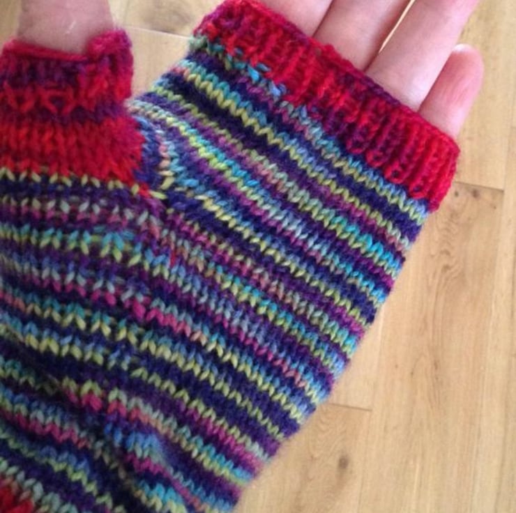 A unique hand knitted fingerless glove/ hand warmer in a jazzy merino wool. Made in 4 ply merino sock yarn which is 75% merino 25% nylon. Really soft. Hand made in Lancashire, U.K.