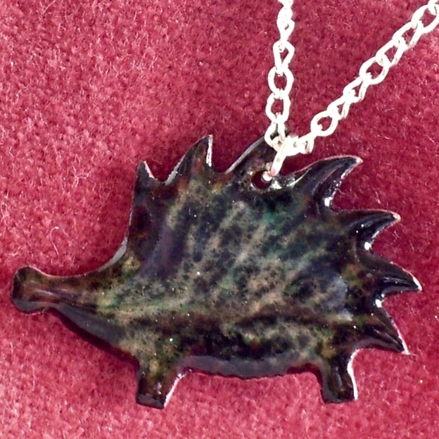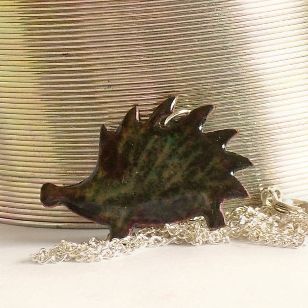 After building several layers of clear enamel on the copper base I added a layer of black into which I drew the hedgehog's spines before firing it. The spines show through the black in tones of golden brown.