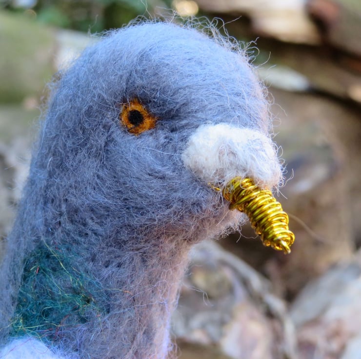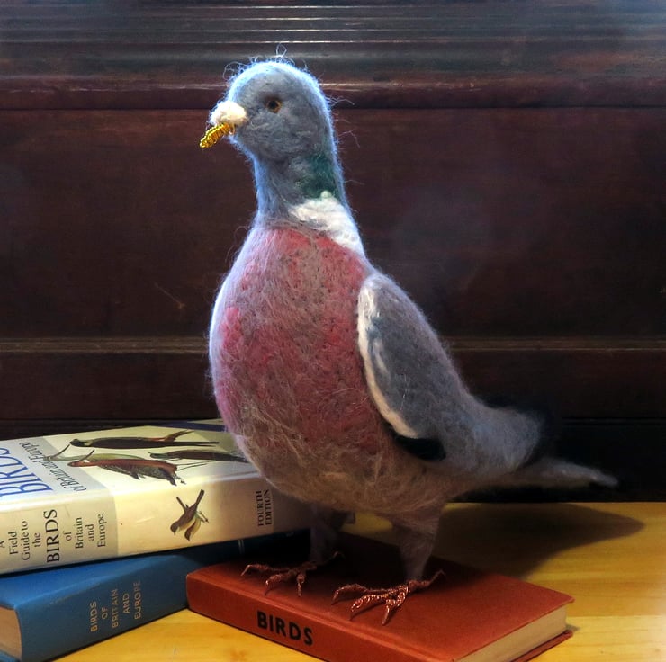 This freestanding wood pigeon is needle felted over a wire framework for extra stability, with wrapped wire feet and beak