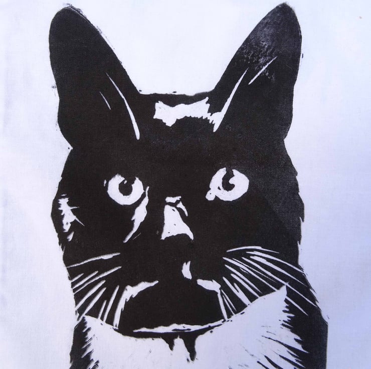Lino print of a cute cat in black oil based ink.