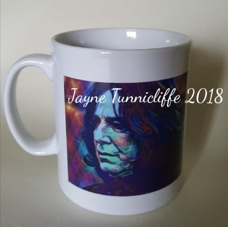 A ceramic mug /cup featuring Alan Rickman as Severus Snape from an original Jayne Tunnicliffe design. The image is on both sides of the mug.
